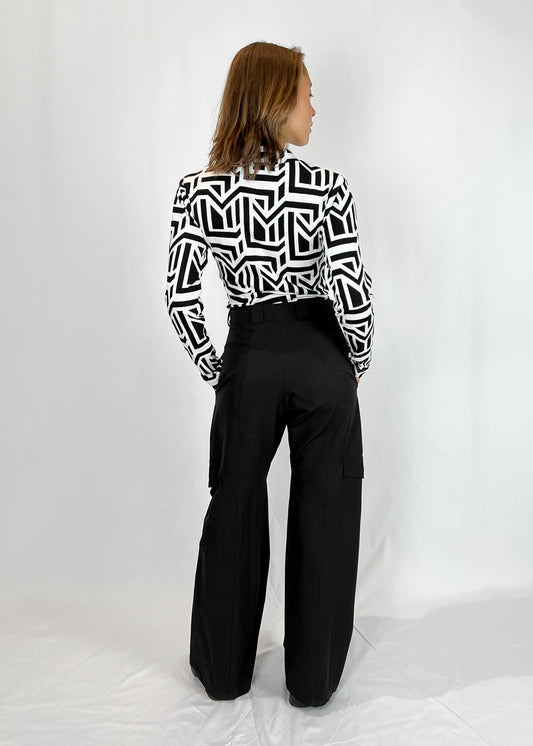 Long Sleeve Top in Black and White Geometric Pattern Jersey "Vicky”