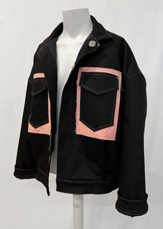 Oversized Collared Jacket with Patch Pockets in Black and Pink Denim "Jesse"