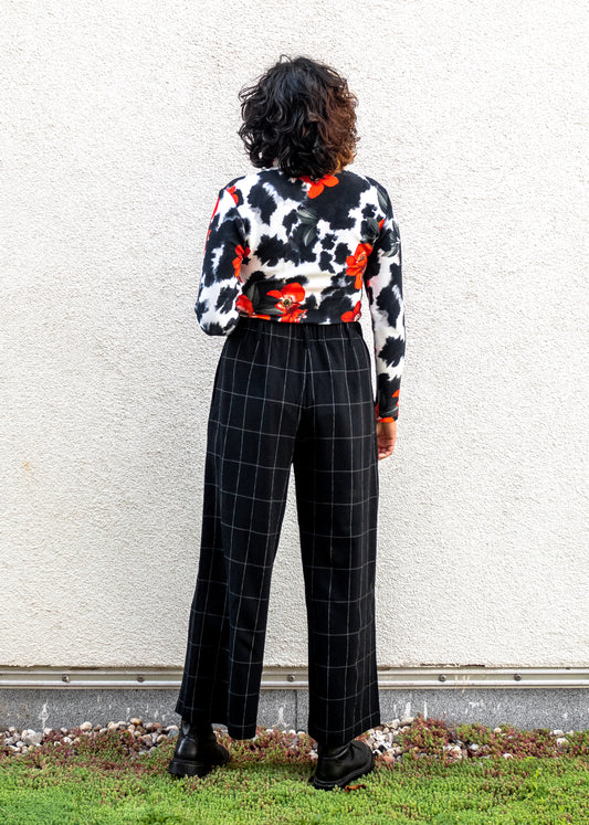Loose Leg Trousers with Elasticised Waist in Black Graph Check Wool "Luise"