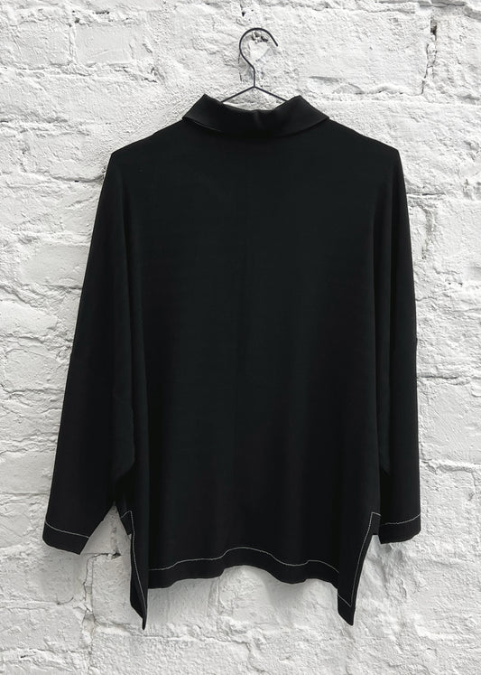 Collared Shirt with 3/4 Sleeve in Black Viscose Acetate with White Topstitching "Lynn"